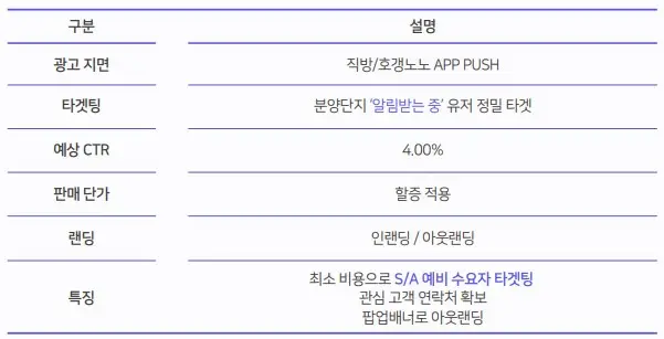 예) 서울특별시 강남구, 서초구, 송파구 – 2주 내 15억 이상 단지 3개 이상 조회한 유저 & 분양일정 관심 유저 예) 창경궁롯데캐슬시그니처 단지 ‘알림 설정’ 유저 단지 정보를 직접 확인한 이후, **관심도를 명확히 드러낸 유저(알림 신청자)**를 선별하여 실질적 구매 가능성이 높은 타겟에게 정밀하게 광고를 노출할 수 있습니다. 이는 단순 노출이 아닌, 행동 기반의 고의도(high-intent) 유저 타겟팅으로 광고 효율을 극대화하고, 실제 전환으로 이어질 가능성을 높여줍니다.