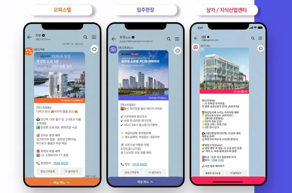 직방 호갱노노 네모 채널톡 수익형상품 및 기타 수익형 상품 구매가능 고객 맞춤 문자광고 주거용 부동산은 물론,상가, 오피스텔 등 비주거용 부동산, 민간임대주택, 지역주택조합 분양사업 등 다양한 유형의 부동산 상품을 아우르는 전방위적 캠페인 집행이 가능합니다.광고 목적과 타깃에 맞춰 맞춤형 솔루션 제공이 가능하며,유형에 관계없이 최적의 노출 전략과 실질적인 마케팅 성과를 기대할 수 있습니다. TV광고 알아보기
