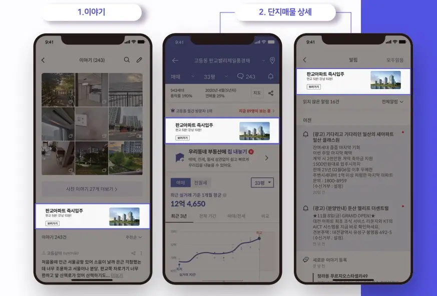 커뮤니티 DA 패키지세부 타겟팅을 통해 송출하는 온라인현수막 특정 단지 방문 유저 타겟 광고 패키지입니다.호갱노노 유저들이 가장 많이 방문하는 ‘이야기’ 지면이 포함되어 있습니다. TV광고 알아보기