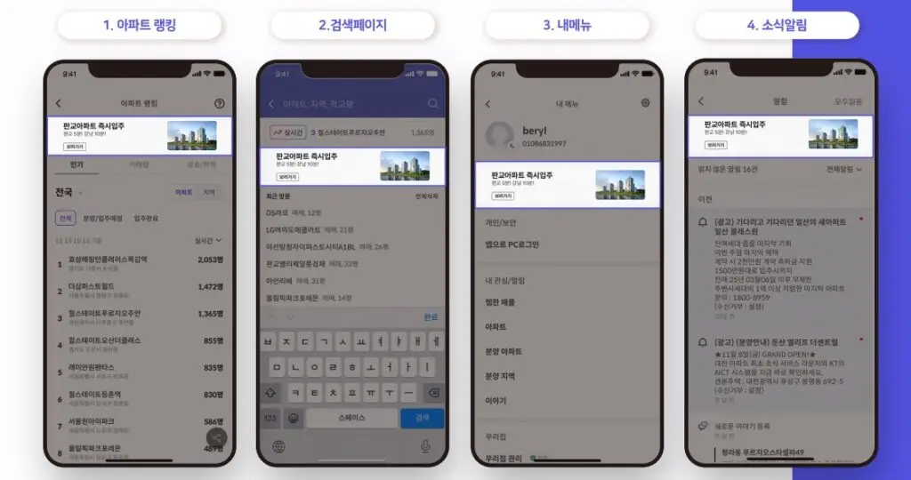 호갱노노 메인존 DA 패키지세부 타겟팅을 통해 송출하는 온라인현수막 아파트 랭킹 상단과 검색 페이지 상단에 노출되는 패키지 입니다.인기 단지/분양 관심 유저 및 단지/매물 검색 유저 대상 상단 고정 노출 됩니다. TV광고 알아보기